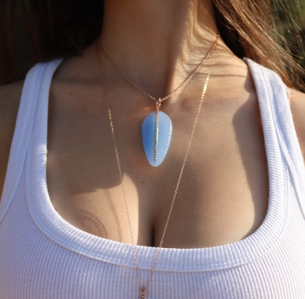 Our feather necklace features a natural stone, carved into the shape of a feather and traced by a row of white cubic zirconia in rose gold plating. Crafted from 925 sterling silver with 2 micron rose gold plating. Available in Rose Quartz, Green Onyx, Turquoise, Aquamarine Quartz, and White Agate. each stone unique in its own way. The necklace itself measures 65/35 cm and comes with an additional extension chain.