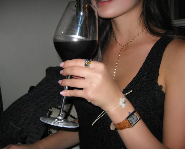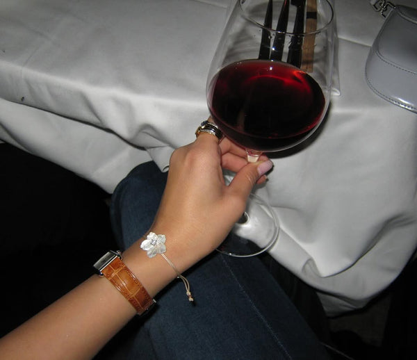 Handmade flower bracelet crafted from a stainable cord. At the center is placed a hand carved mother of pearl flower with a zircon at its center. The zircon setting is available in 925 silver, yellow gold plating, or rose gold plating. The bracelet is finished with two beads at the closure. To preserve the jewelry, avoid contact with water.