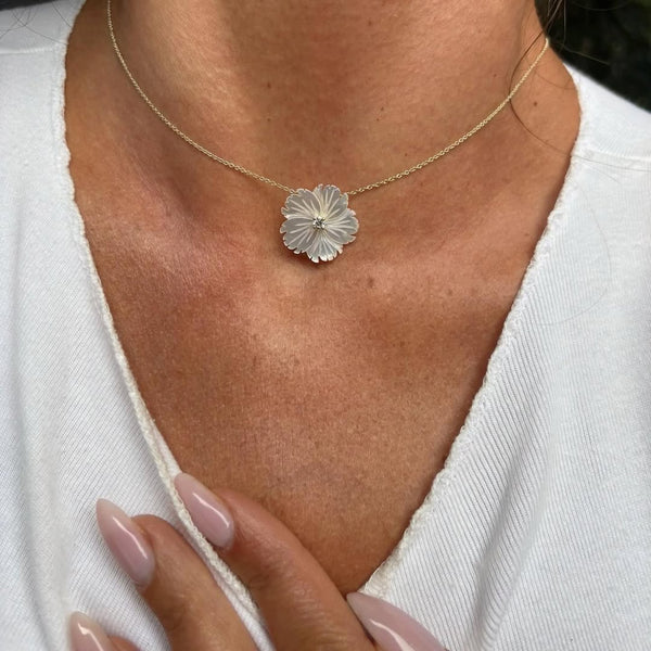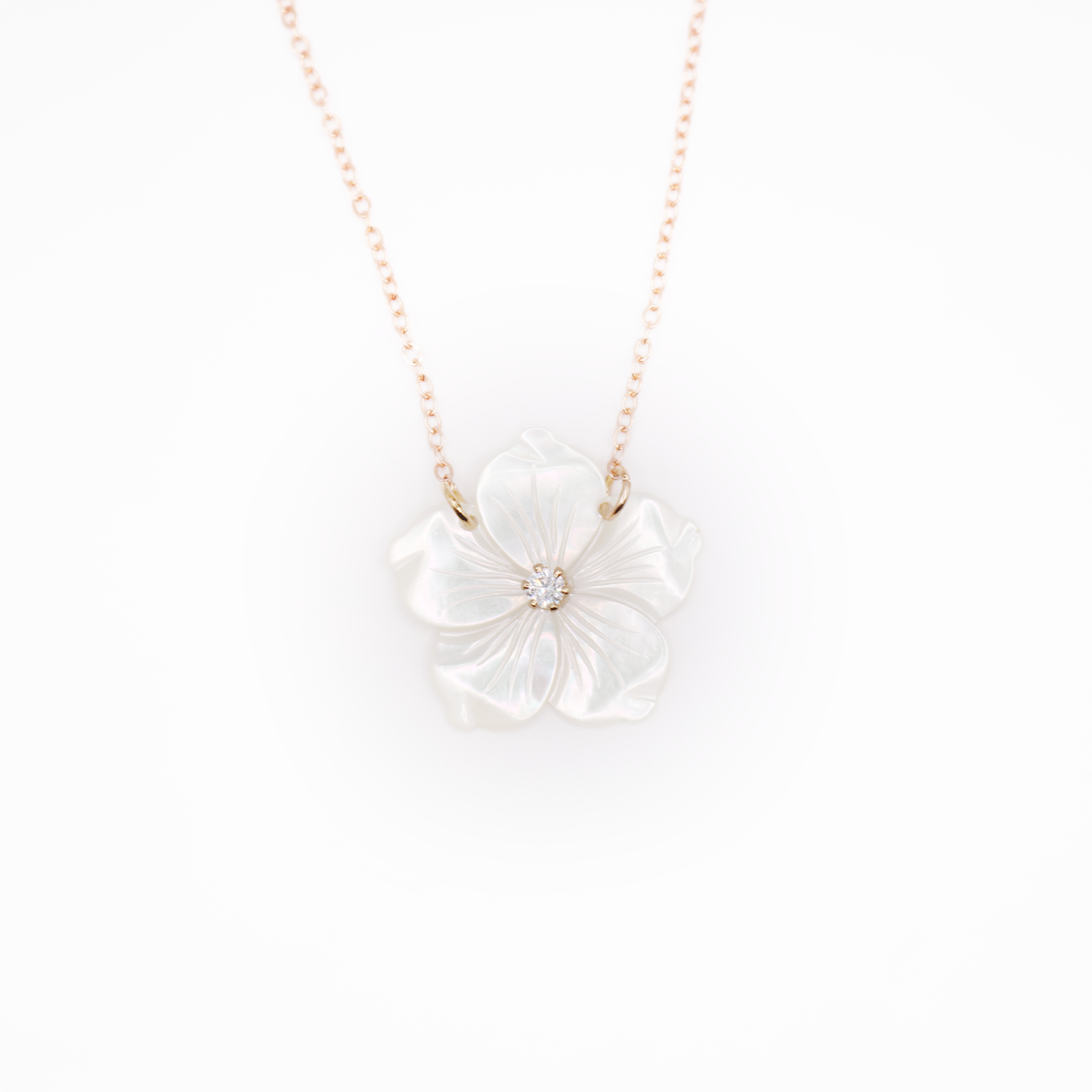 Handmade flower necklace, available in 925 silver, 2 micron yellow gold plating, or 2 micron rose gold plating. The centerpiece is a mother of pearl flower, hand-carved and set with a white zircon at the center. To preserve the necklace, avoid contact with water.